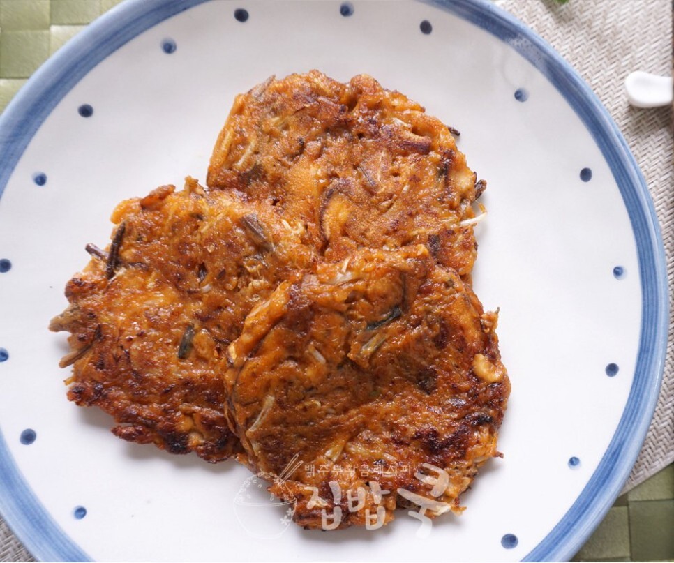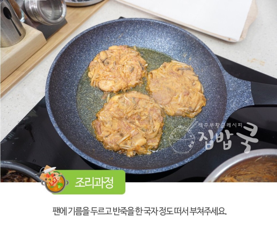 7. 프라이팬에 기름을 적당히 두르고 반죽을 알맞은 크기로 떠서 부쳐주세요. (약불)