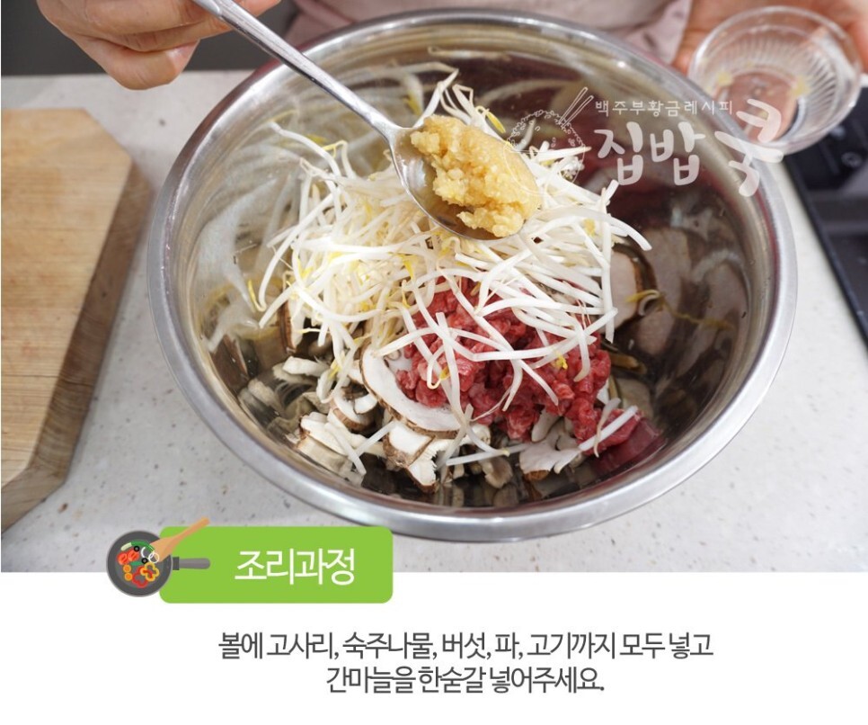 4. 볼에 고사리, 숙주, 버섯, 파 고기까지 모두 넣고 간마늘 한 숟갈을 넣어주세요.