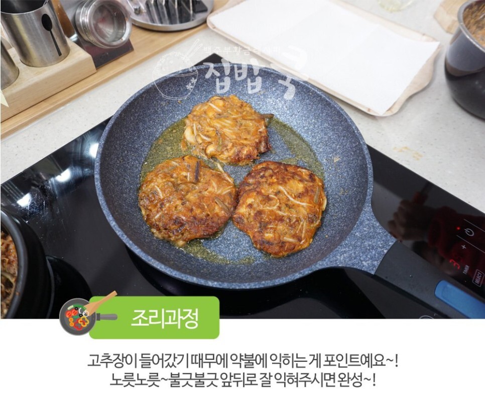 8. 고추장이 들어갔기 때문에 약불에서 익히는 게 포인트입니다. 노릇노릇하게 앞뒤로 잘 익혀주시면 고추장 나물전 완성~!