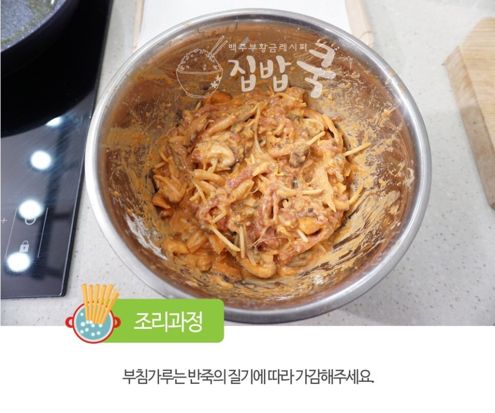 6. 재료와 양념이 잘 섞였다 싶으면 부침가루 한 컵 정도를 확인해 가면서 조금씩 조금씩 넣어주세요. (반죽이 너무 묽으면 잘 안 부쳐집니다ㅜㅜ)