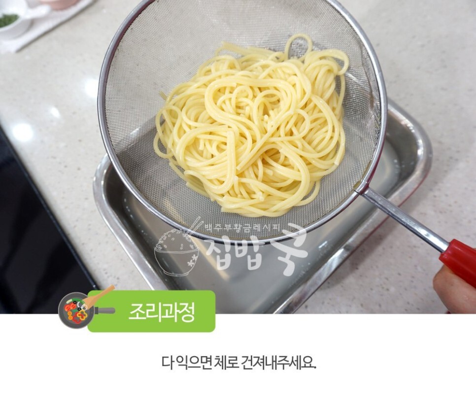 6. 면이 잘 삶아져서 다 익으면 체로 면을 건져내 주세요.(면을 삶았던 물은 다 버리지 마시고 면수용으로 반 컵 정도 챙겨주세요)