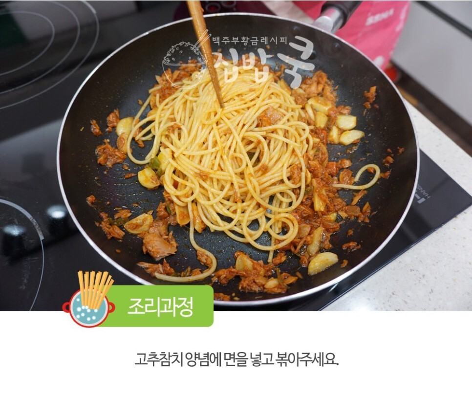 7. 고추참치 양념에 면을 넣고 볶아주세요. 혹시 볶으실 때 너무 뻑뻑하거나 볶다가 재료들이 탈것 같으면 아까 챙겨두었던 면수를 조금씩 조금씩 추가하셔서 볶아주시면 고추참치 파스타 완성~!
