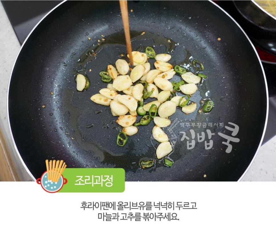 2. 프라이팬의 올리브유를 넉넉하게 두르고 마늘과 고추를 볶아주세요.
