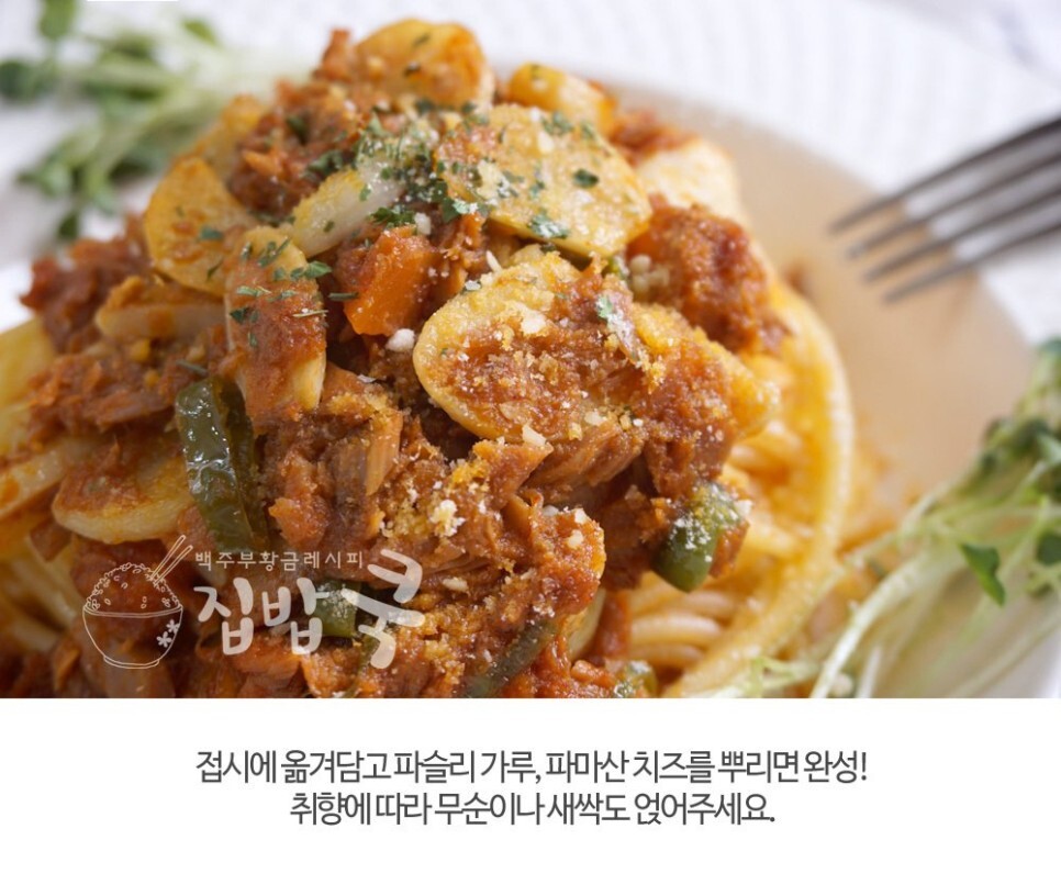 완성된 고추참치 파스타를 접시에 옮겨 담고 취향에 따라 파슬리 가루나 파마산 치즈를 뿌리셔도 됩니다.
