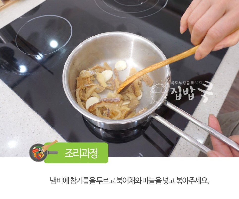 6. 냄비에 참기름을 두르고 북어채와 마늘을 넣고 맛있게 볶아주세요.