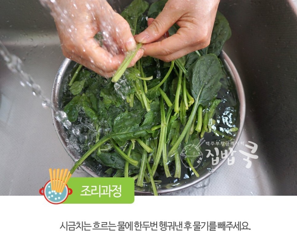 2. 시금치는 잘 손질하여 흐르는 물에 헹궈낸 후 물기를 빼주세요.