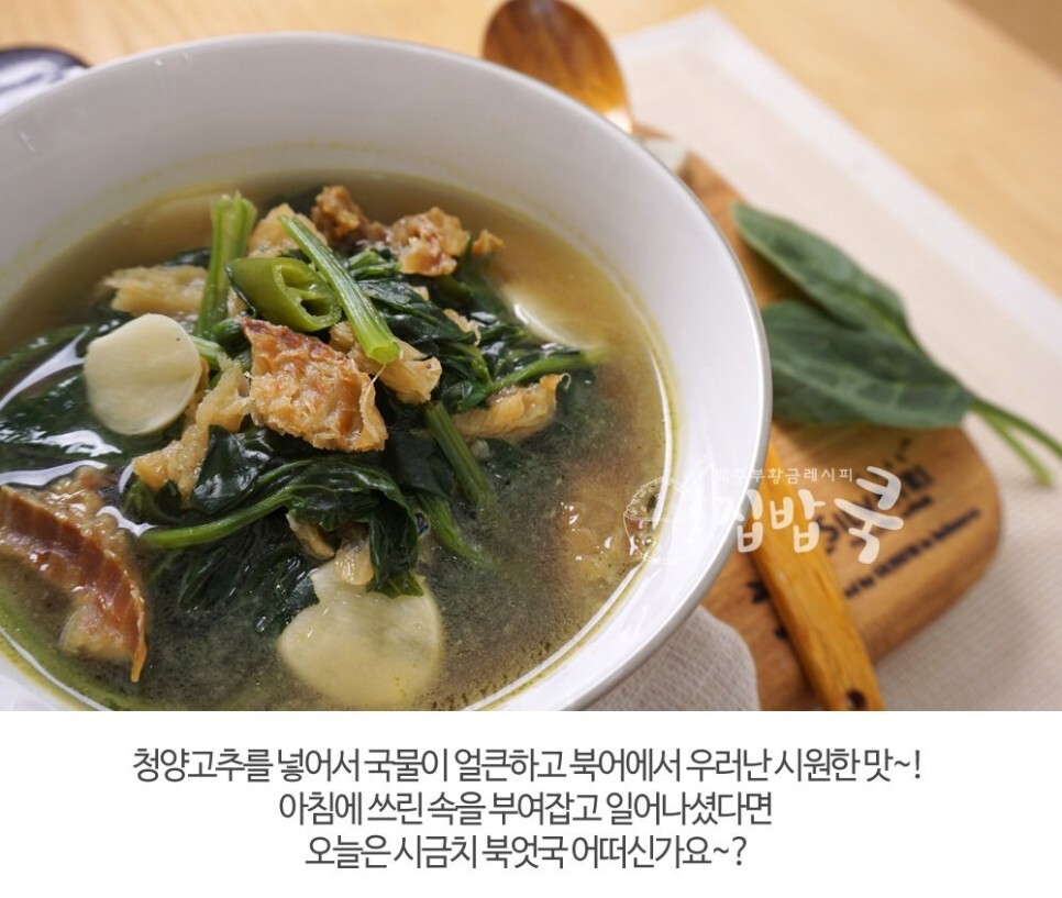 본격적으로 추석 연휴가 시작되면서 과음을 하고 계시진 않은가요??ㅎ 그럼 다들 어떻게 해장을 하시나요? 해장은 해야겠고 가족들 국도 끓여줘야겠고.. 그럴 땐 이 레시피를 강력 추천드립니다. 바로 시금치 북엇국 시금치는 체내 수분을 조절하고 갈증을 멈추게 하며, 속을 편하게 하고 술독을 풀어주는 좋은 식품으로 널리 사용되고 있답니다. 또한 북어는 다들 알고 계시죠? 숙취 해소와 알코올 해독에 좋은 식재료 인걸요 이 두 가지 식재료가 만났으니 오늘 혹은 내일 해장은 시원하고 개운한 시금치 북엇국으로 해보세요!