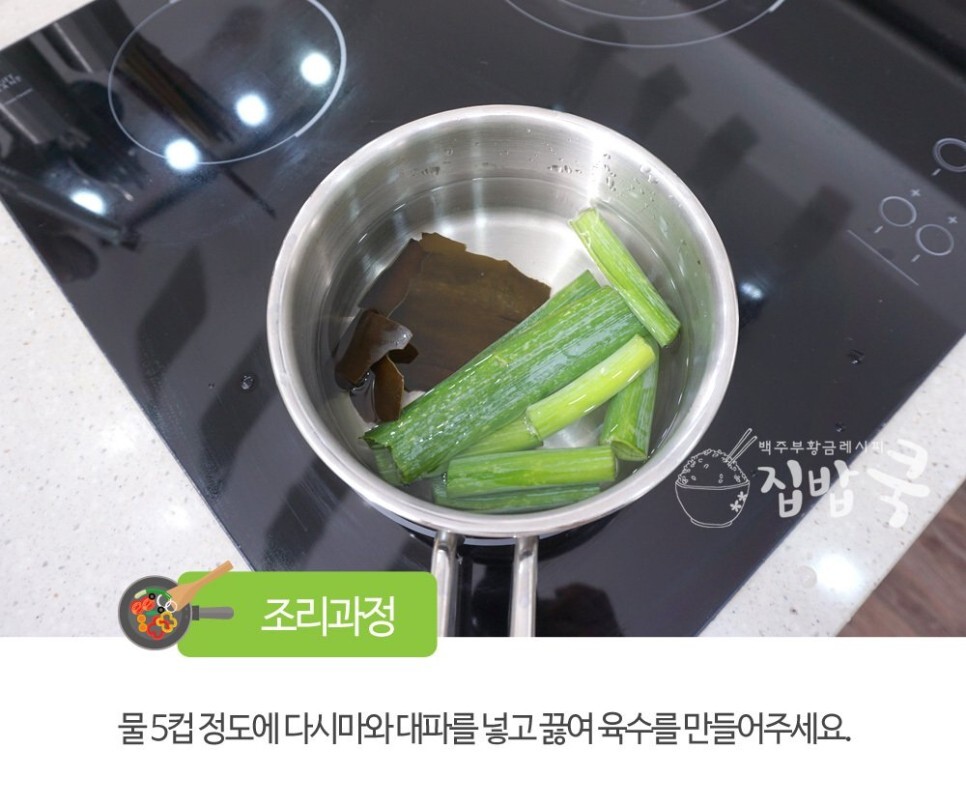 1. 물 5컵 정도에 다시마와 대파를 넣고 끓여 육수를 만들어 주세요.