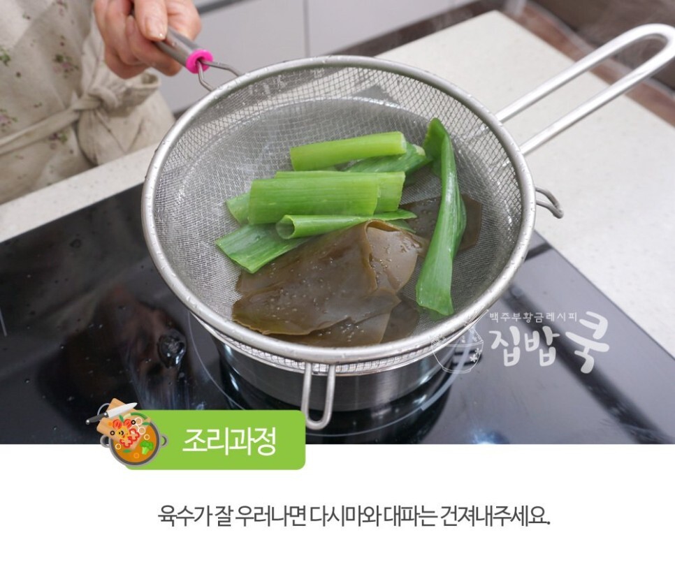 5. 육수가 잘 우러나면 다시마와 대파는 건져내주세요.