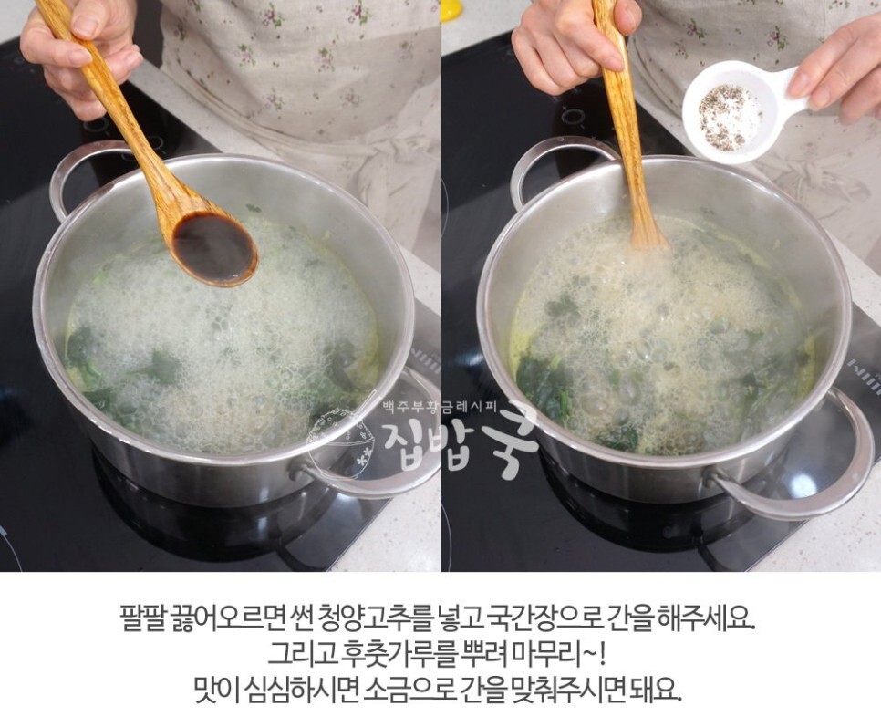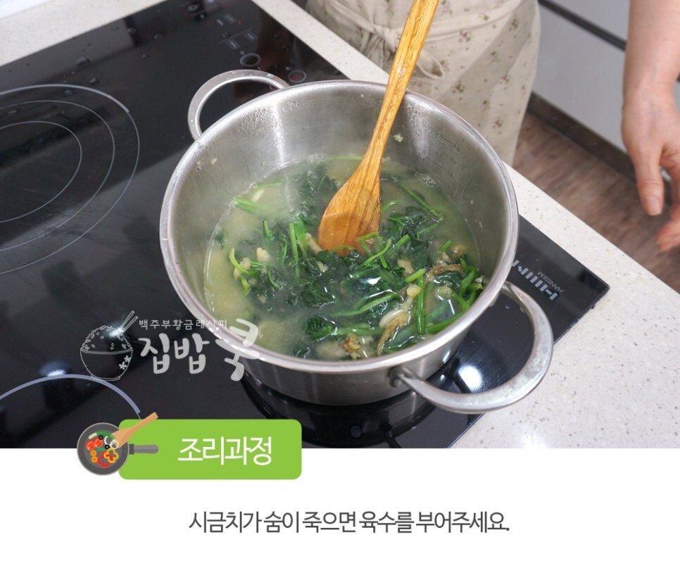 8. 시금치 숨이 죽으면 육수를 부어주세요.