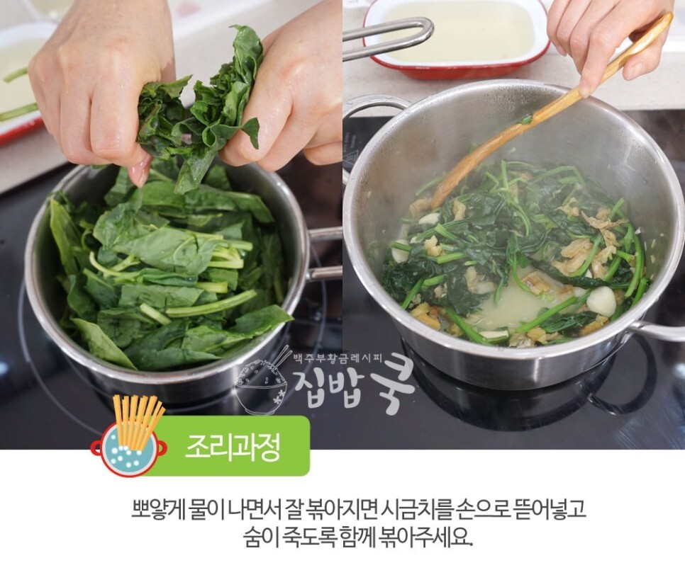 7. 뽀얗게 물이 나오면서 잘 볶아지면 시금치를 먹기 좋은 크기로 뜯어서 넣고 숨이 죽도록 함께 볶아주세요.
