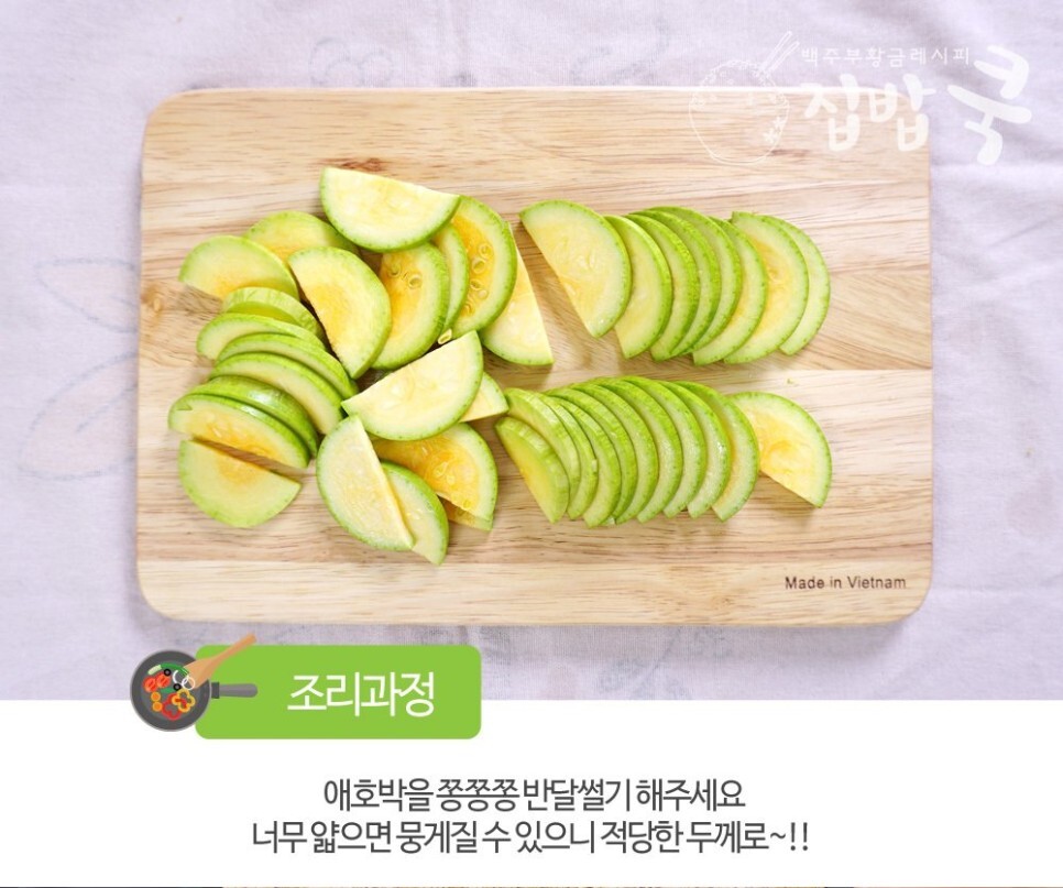 1. 애호박을 반달 썰기 해주세요 애호박 두께가 너무 얇으면 뭉개질 수 있으니 적당한 두께로 썰어주세요.