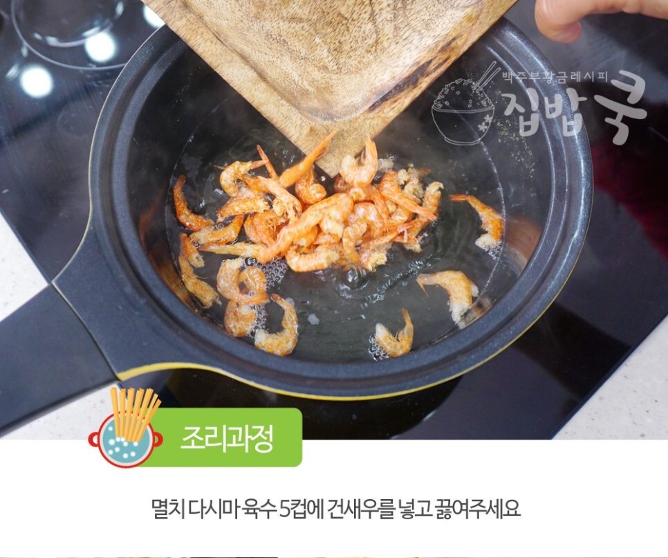 2. 멸치와 다시마 육수를 우려내어 건더기를 건져내고 건새우를 넣고 조금 더 끓여주세요.
