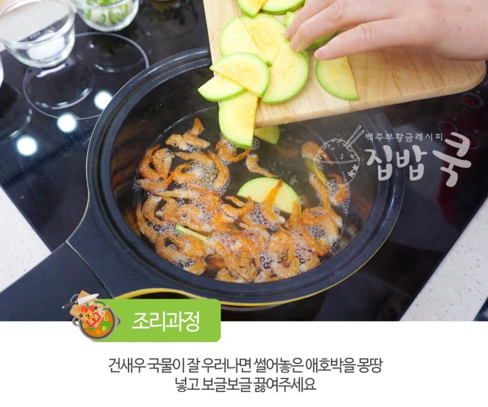 3. 건새우 국물이 우러나면 썰어놓은 애호박을 몽땅 넣고 보글보글 끓여주세요.