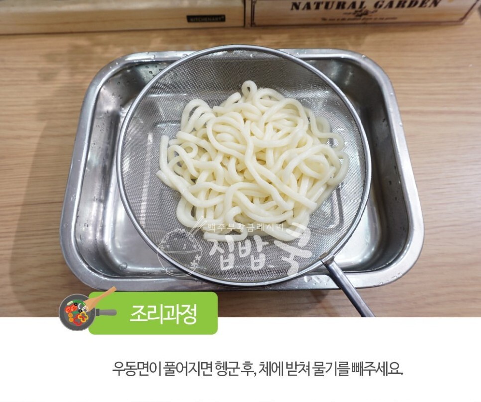 4. 우동면이 풀어지면 찬물에 헹군 후, 체에 밭쳐 물기를 빼주세요.