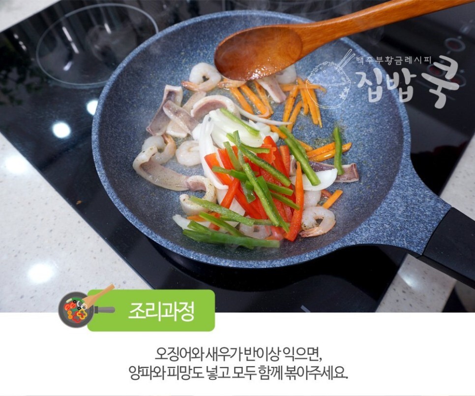 6. 당근이 살짝 익으면 오징어와 새우도 넣고 후추를 살짝 뿌려서 볶아주세요.