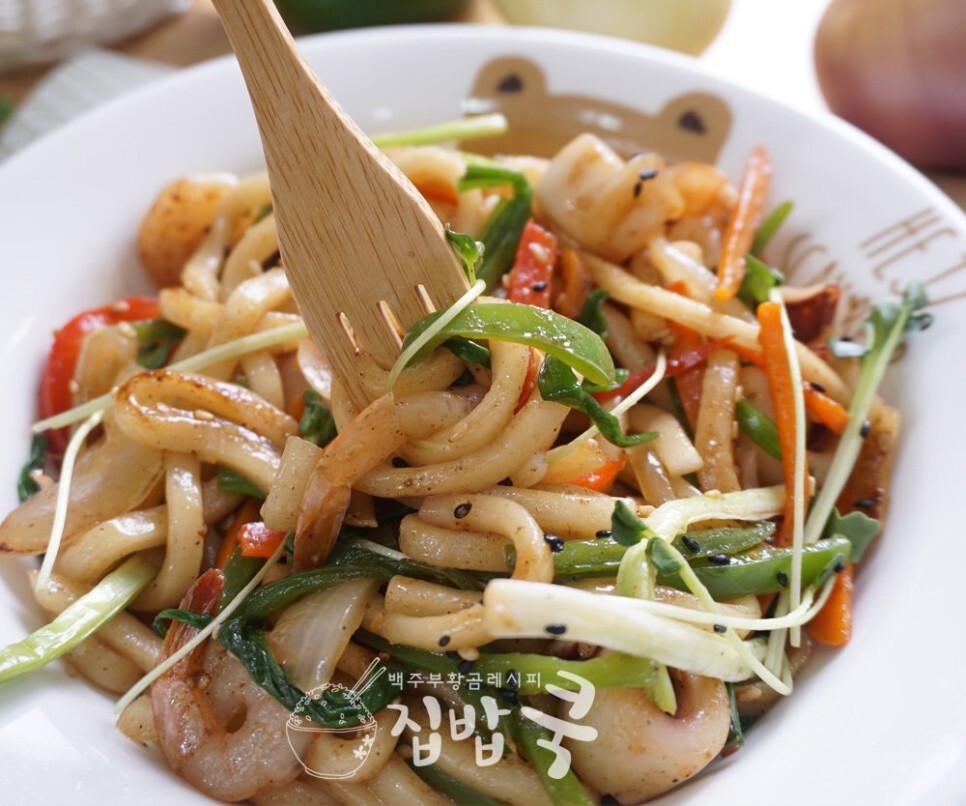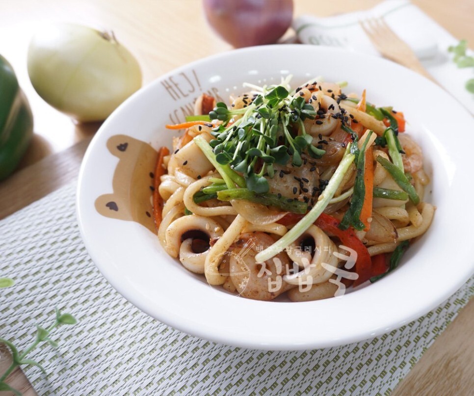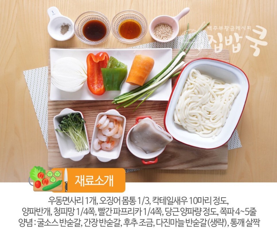 통통한 오징어와 새우 거기에 굴 소스 간장으로 볶아낸 우동은 맛이 일품이죠 양념이 맵지 않기 때문에 아이들이 먹기도 너무 좋아요 그리고 맵고 칼칼한거 좋아하시는 분들은 고추기름을 추가하시거나 청양고추나 고춧가루를 추가해서 드시면 맵고 칼칼하게 드실 수가 있어요. 그럼 지금부터 해물 볶음 우동 소개를 시작하겠습니다.