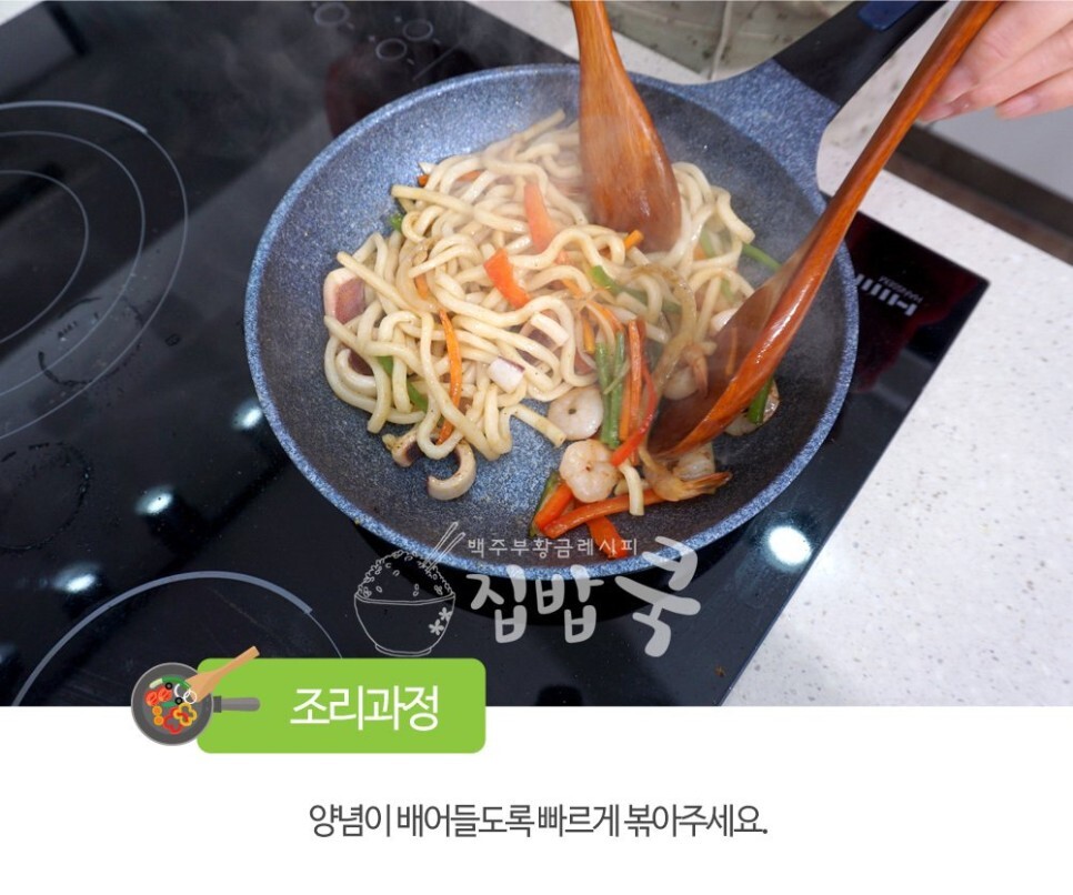 8. 야채들도 거의 볶아지면, 물을 빼놓은 우동 사리를 넣고 기존 재료들과 섞으면서 볶아주세요. 센 불에 후다닥 빠르게 볶아야 하니깐 도구를 두 개를 사용해서 하시면 더 수월해요.