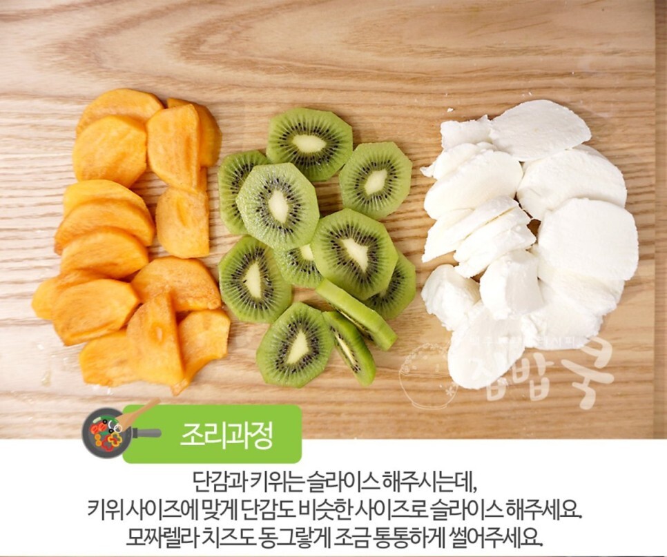 1. 단감과 키위는 슬라이스 해주세요 여기서 포인트는 키위랑 단감 크기가 비슷한 크기로 썰어주셔야 보기에도 좋아요 모짜렐라 치즈도 동그랗고 통통하니 썰어주세요.