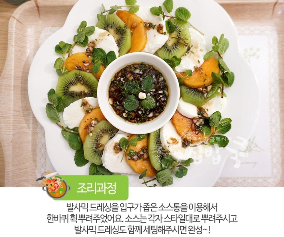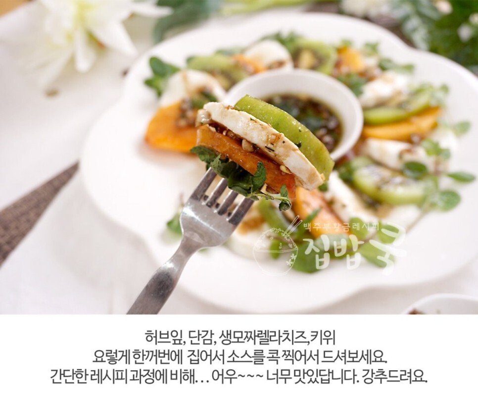 단감과 치즈 거기에 키위까지 한꺼번에 포크로 콕 찍어서 드셔보세요 굉장히 간단한 레시피 과정에 비해 너무 맛있답니다. 꼭 한번 도전해 보세요! 뿐만 아니라 여기서 알려드린 발사믹 드레싱은 육류 요리나 여러 샐러드에도 어울리고 따끈한 빵에 찍어 먹어도 맛있는 만능 드레싱 소스니깐 꼭 기억해 두셔서 다방면으로 활용해 보세요 오늘은 눈처럼 하얀 모짜렐라 치즈와 초록 허브 잎으로 어우러진 키위 단감 카프레제를 만들어 봤는데요 꼭 토마토가 아니더라도 이렇게 다양한 과일로 색다르게 연출해 보시는 것도 좋을 것 같아요 그럼 다음에도 더 이쁘고 재미난 레시피를 들고 찾아오겠습니다. 감사합니다.