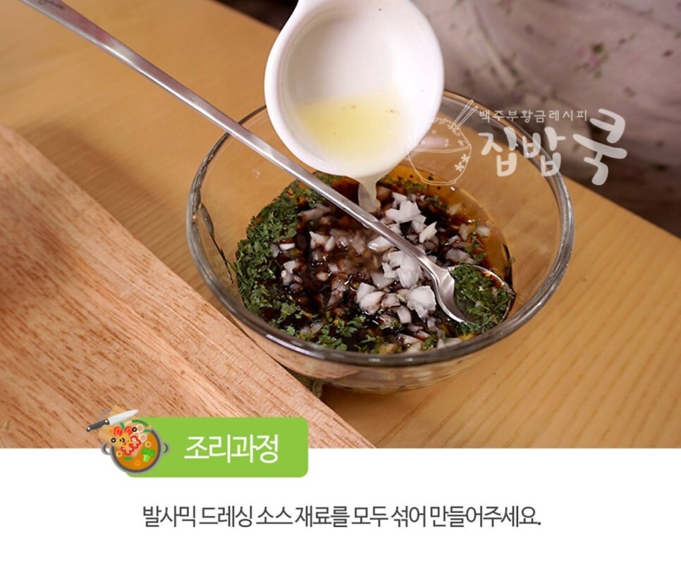 3. 발사믹 식초 3 숟갈, 올리브유 4 숟갈, 다진 양파 2 숟갈, 레몬즙 1 숟갈, 꿀 반 숟갈, 파슬리 가루, 소금으로 발사믹 드레싱 소스를 만들어 주세요.