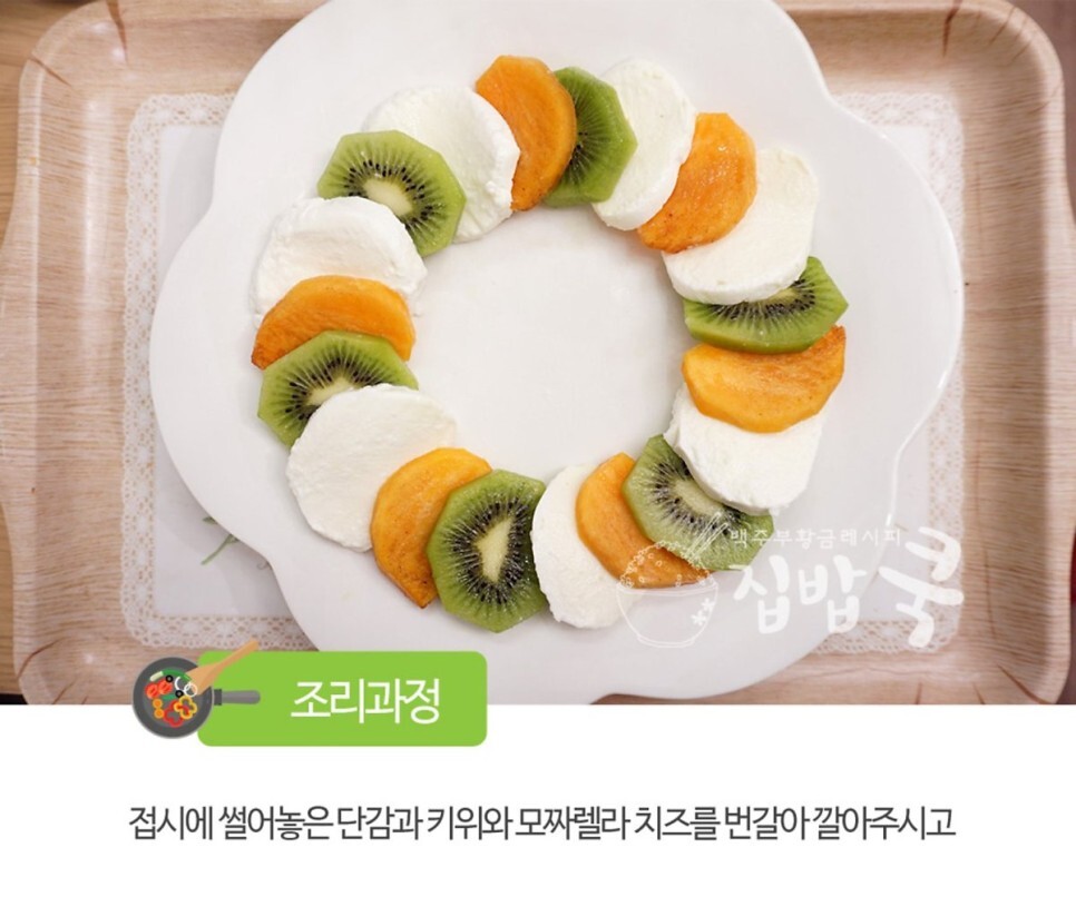 4. 접시에 썰어놓은 단감과 키위와 모짜렐라 치즈를 번갈아 깔아주시고