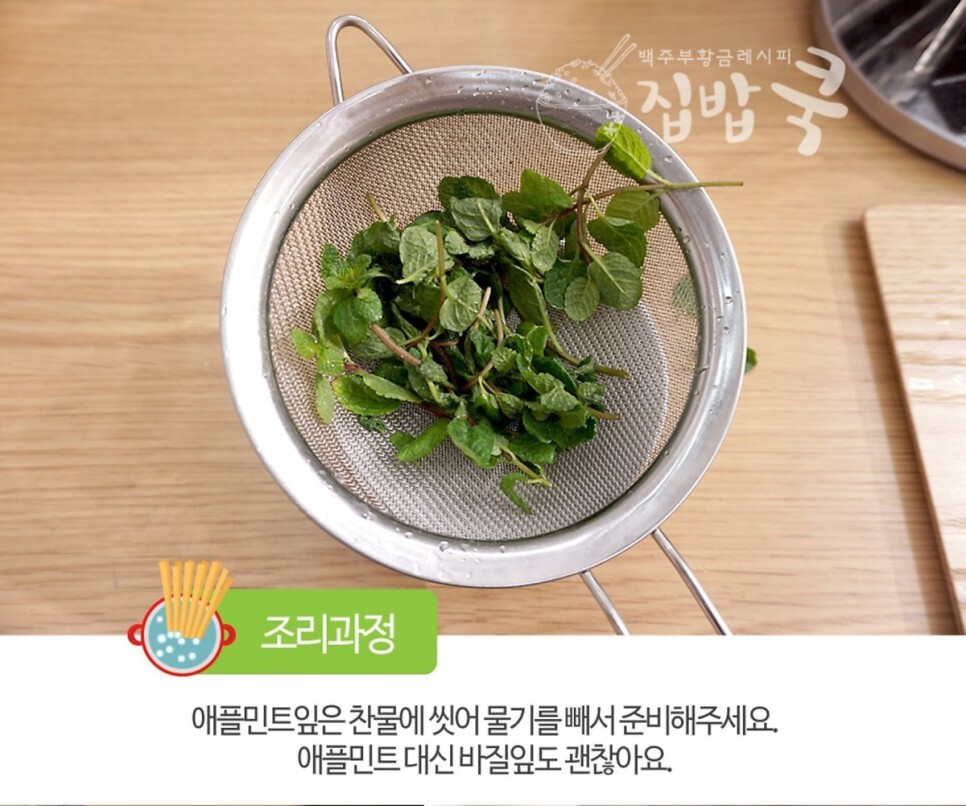 2. 애플민트는 찬물에 씻어 물기를 빼서 준비해 주시고 애플민트 대신해서 바질도 괜찮은 선택이니깐 참고해 두시면 좋아요.