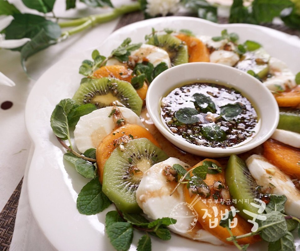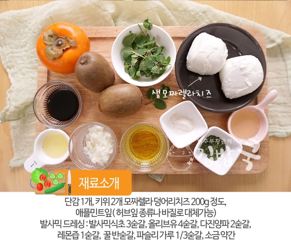 카프레제 하면 보통 어떤 걸 먼저 떠올리게 되시나요? 우리가 흔하게 볼 수 있는 카프레제는 토마토를 이용해서 카프레제를 만들게 되잖아요 ㅎ 오늘은 토마토가 아닌 키위와 단감을 이용해서 만들어 보려고 해요