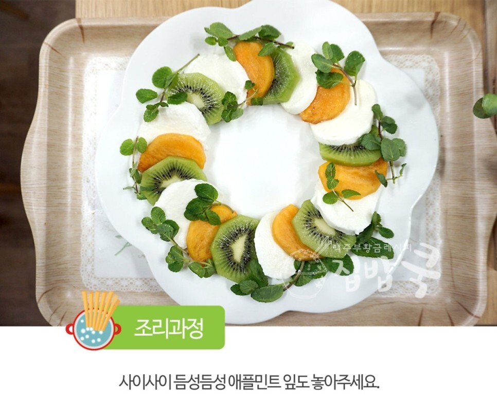 이렇게 키위와 단감 그리고 모짜렐라 치즈로 색감도 좋고 맛도 좋고 애플민트로 마무리까지~ 보기만 해도 맛있어 보이죠!? ㅎ 토마토 카프레제가 아닌 키위 단감 카프레제를 시작하겠습니다.