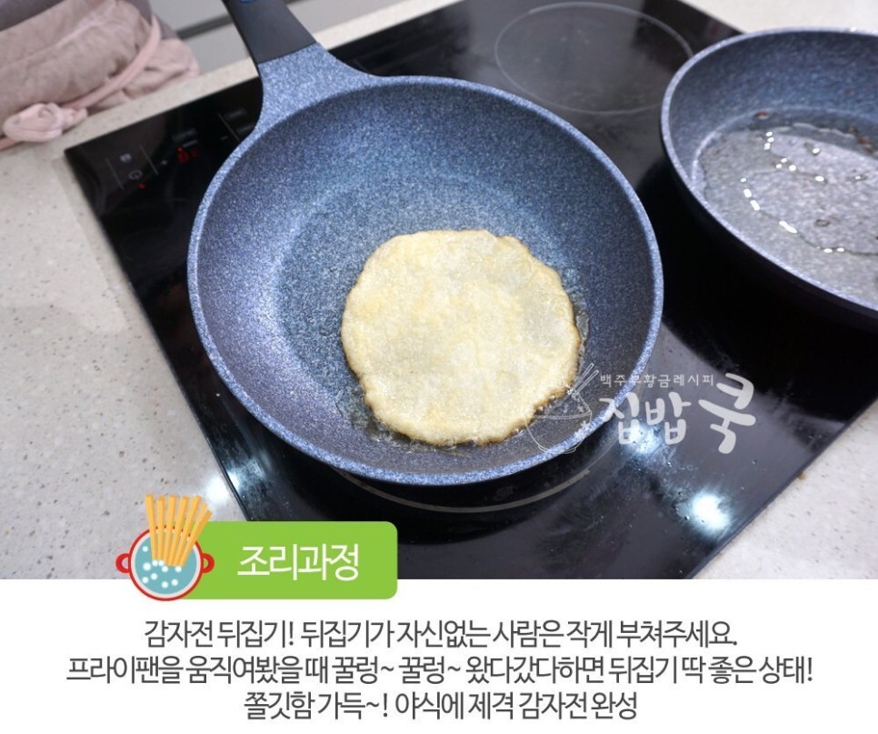 10. 프라이팬에 기름을 두르고 감자전을 앞뒤로 잘 부쳐주세요 혹시! 뒤집기가 자신 없는 사람은 반죽을 작게 해서 부쳐주셔도 좋아요