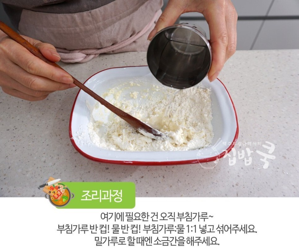 5. 그다음 부침가루 반 컵 + 물 반 컵 1:1 비율로 넣고 섞어주세요 (밀가루를 사용하실 때는 소금 간을 해주세요)