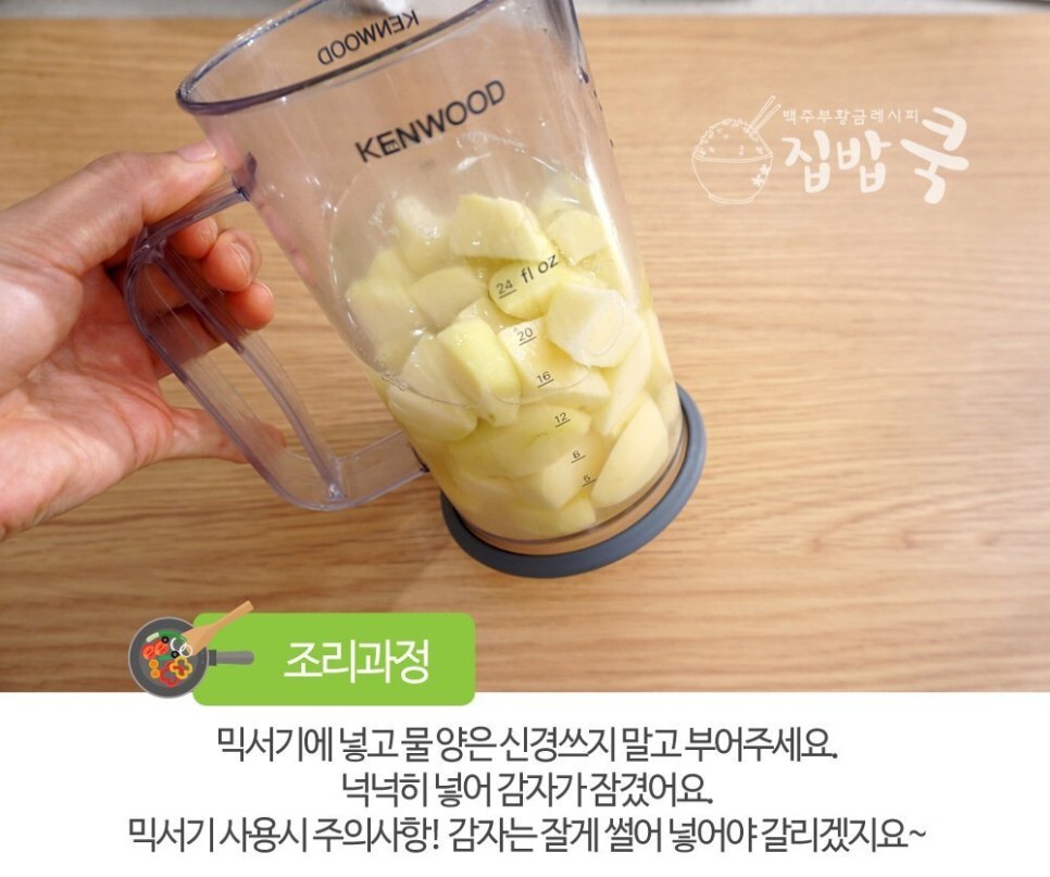1. 감자를 한 입 크기로 손질하여 믹서기에 넣고 물과 함께 넣어주세요 (물 양은 신경 쓰지 말고 부어주세요)