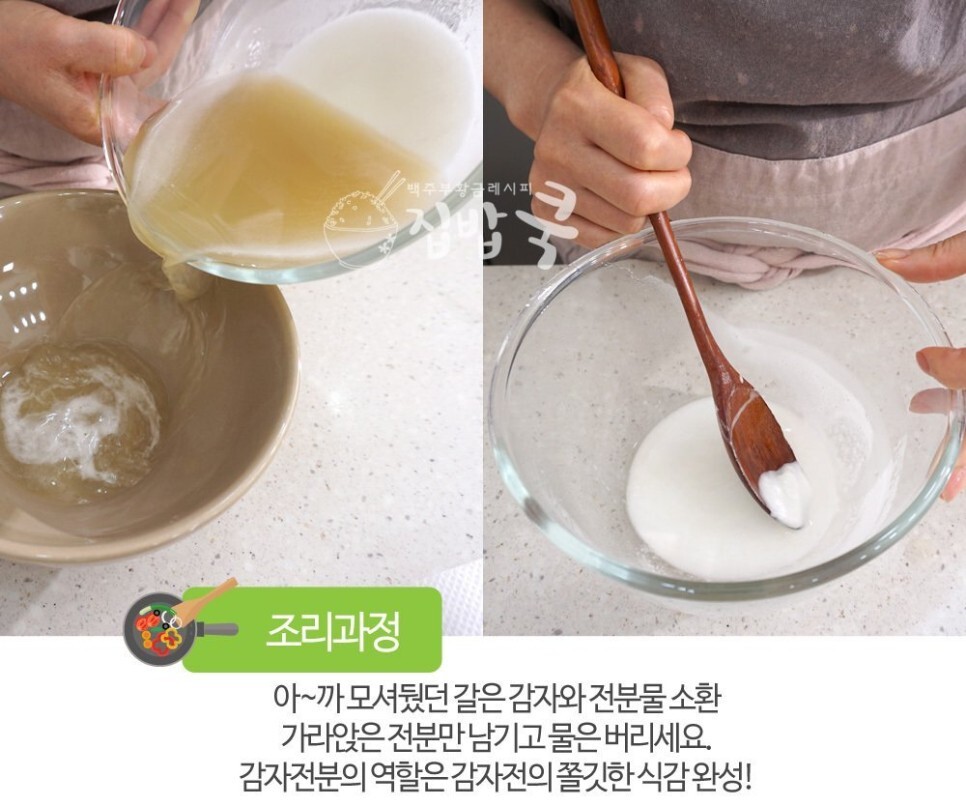 8. 자! 다시 감자전으로 돌아와서~! 시간이 지나 갈은 감자와 전분물을 다시 꺼내서 가라앉은 전분만 남기고 물은 버려주세요.