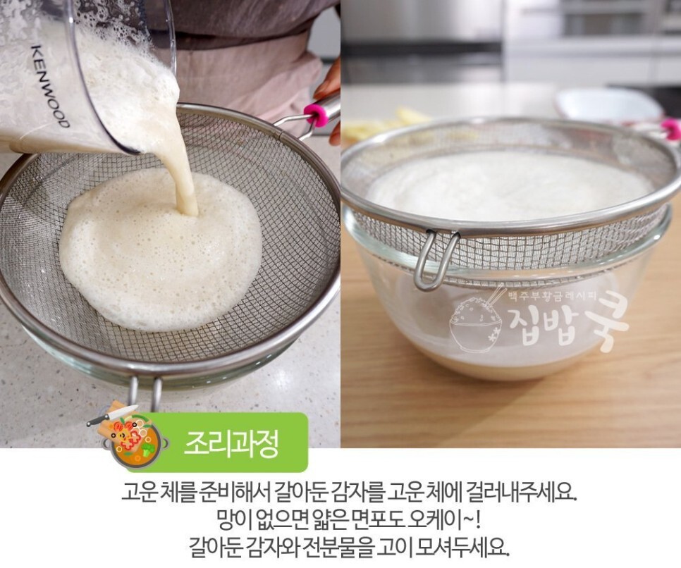 3. 고운 체를 준비해서 갈아둔 감자를 고운 체에 걸러내 주세요. 얇은 면포도 좋습니다. (갈아둔 감자와 전분물을 고이 모셔두세요.)