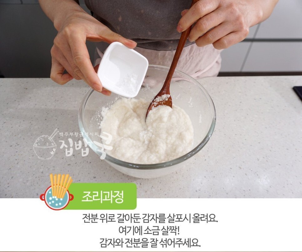 9. 전분 위로 갈아둔 감자를 살포시 올려주세요 여기에 소금 살짝! 감자와 전분은 잘 섞어주세요.