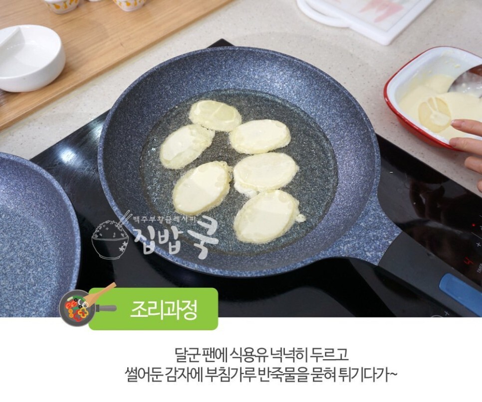 6. 프라이팬에 식용유를 넉넉하게 넣고 썰어둔 감자에 부침가루를 반죽 물을 입혀서 튀겨주세요