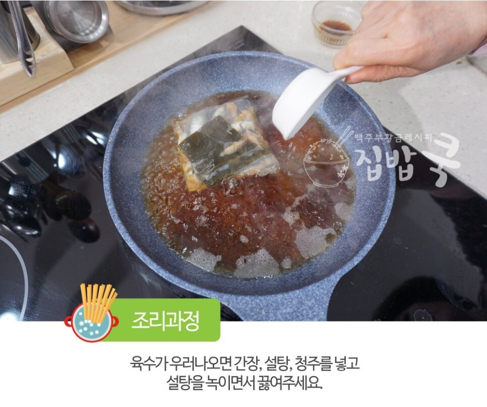 5. 육수가 우러나오면 간장 3숟갈, 청주 1숟갈, 설탕 1숟갈을 저으면서 끓여주세요.