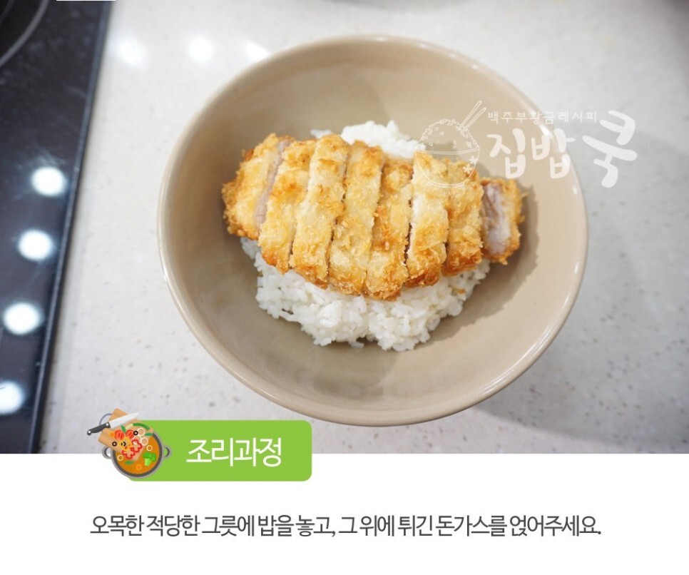9. 오목한 밥그릇에 놓고 그 위에 노릇하게 잘 튀겨진 돈까스를 얹어주세요.
