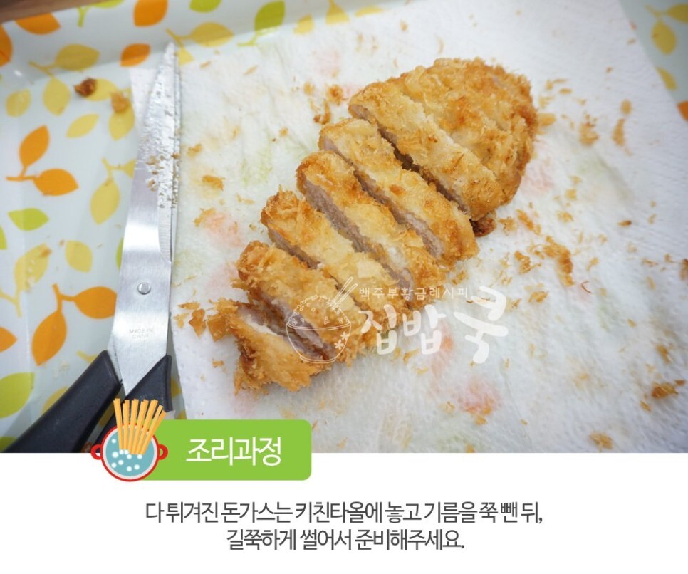 8. 다 튀겨진 돈까스는 키친타월에 놓고 기름을 쏙 빼주신 뒤 길쭉한 모양으로 돈까스를 커팅 해주세요.
