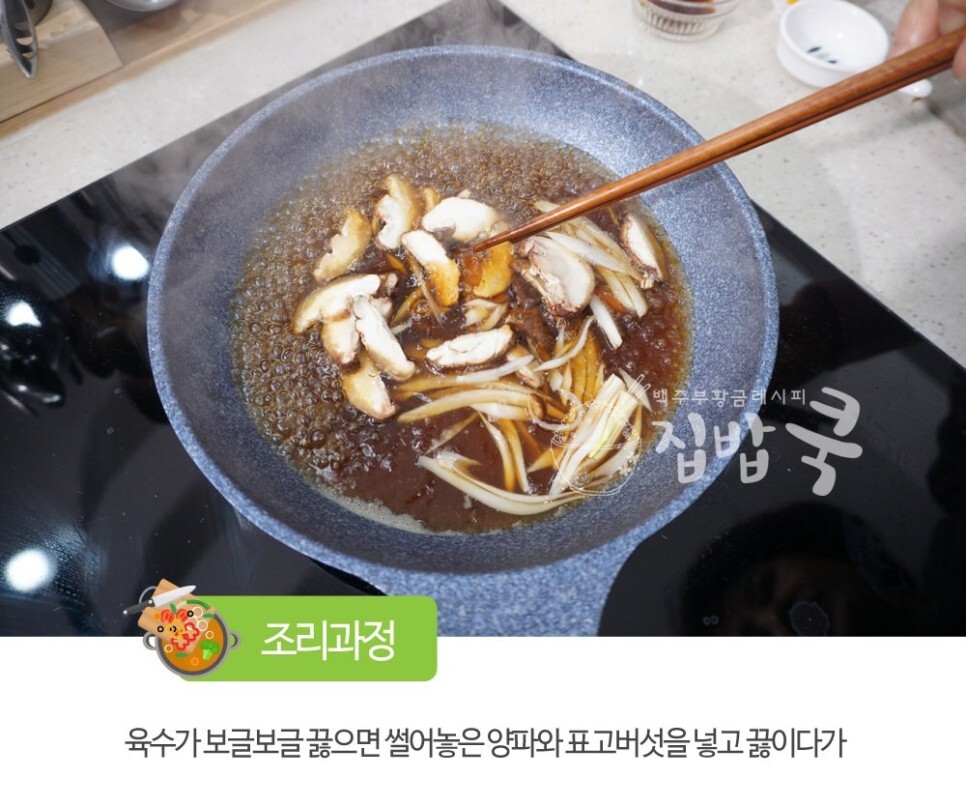 6. 육수가 보글보글 끓으면 썰어놓은 양파와 표고버섯을 넣고 끓여주세요.