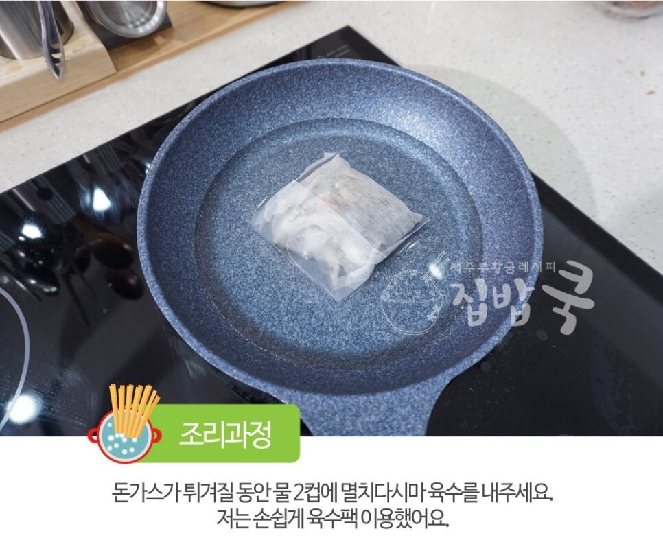 2. 돈까스가 조리되는 동안에 물 2컵에 멸치다시마 육수를 내주세요.