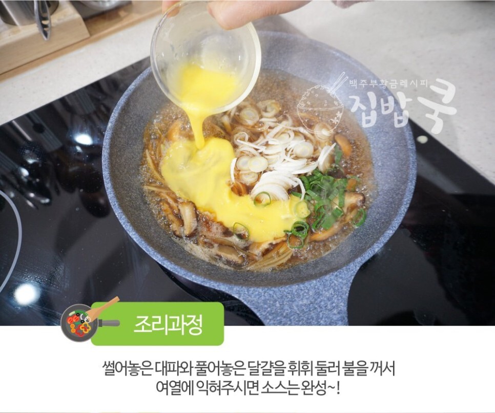 7. 썰어놓은 대파와 풀어놓은 계란을 휙휙 둘러서 불을 끄고 예열에 익혀주시면 소스는 완성입니다~!