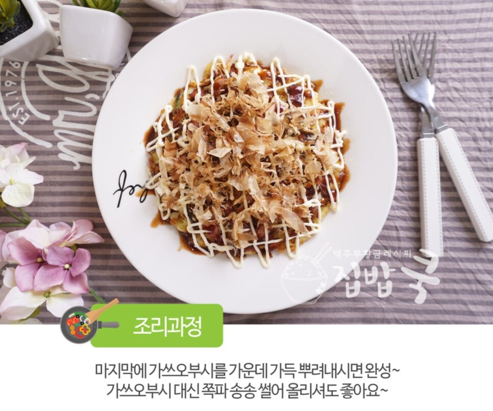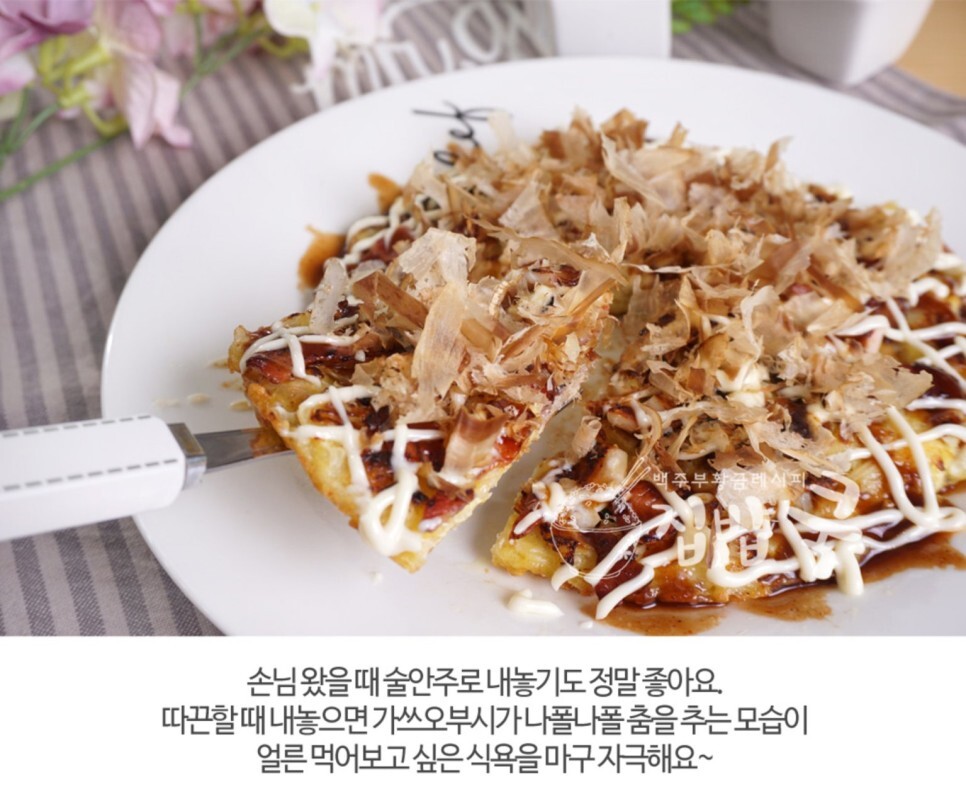완성된 오코노미야끼 위에 살랑살랑 춤을 추는 가쓰오부시~! 개인적으로 소주나 맥주보다 막걸리를 굉장히 좋아하는데 요즘 온라인상에서 막걸리를 검색하면 정말 다양하고 이쁜 막걸리들이 너무나 많이 있더라고요 저도 몇 번 주문해서 마셔봤는데 맛도 너무 좋고 뒤끝도 없는 제품들도 많이 있고요 제가 이 이야기를 하는 이유가 바로 이 오코노미야키와 막걸리 조합이 너무나 끝내주기 때문에 입니다!! 치맥, 피맥과 버금가는 조합이니깐 언제 한번 꼭 "오막" 조합을 드셔보세요 강력 추천드려요 자 그럼 오꼬노미야끼 지금부터 시작하겠습니다. (시판되는 막걸리는 지평 막걸리를 추천드려요 ㅎㅎㅎ)