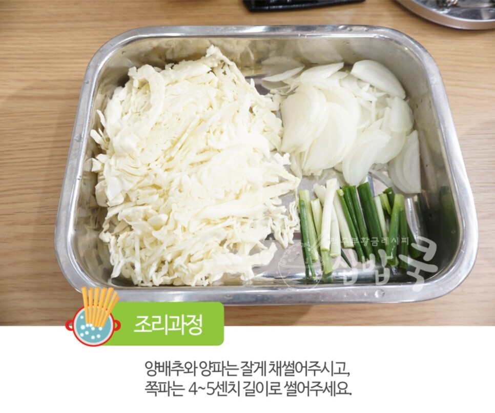 2. 양배추와 양파는 잘게 채 썰어주시고 쪽파는 4~5cm 길이로 썰어주세요.