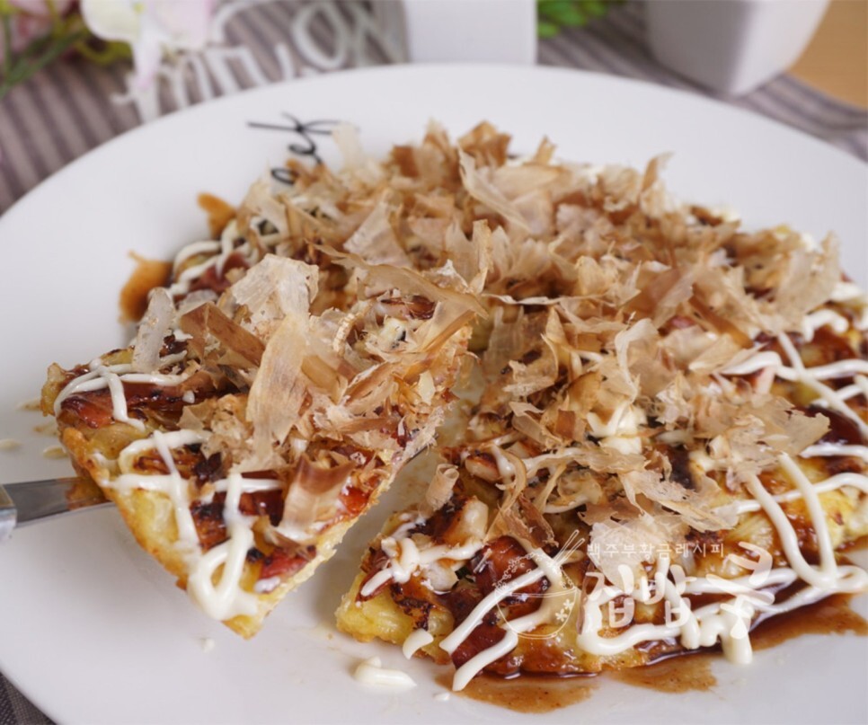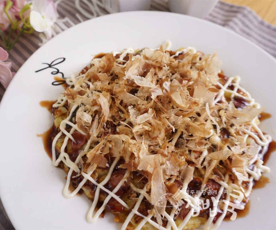 10. 마지막으로 가쓰오부시를 뿌려내시면 오코노미야키가 완성~!