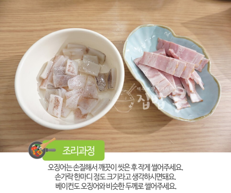 1. 오징어는 손질해서 깨끗하게 세척 후에 오징어와 베이컨은 손가락 한마디 크기로 썰어주세요.