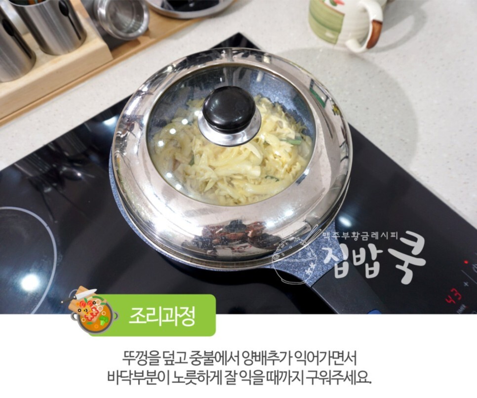 6. 뚜껑을 덮고 중불에서 양배추가 익어가면서 반죽 바닥 부분이 노릇하게 잘 익을 때까지 구워주세요 중불이 너무 쎄면 약불로 해주셔도 됩니다.