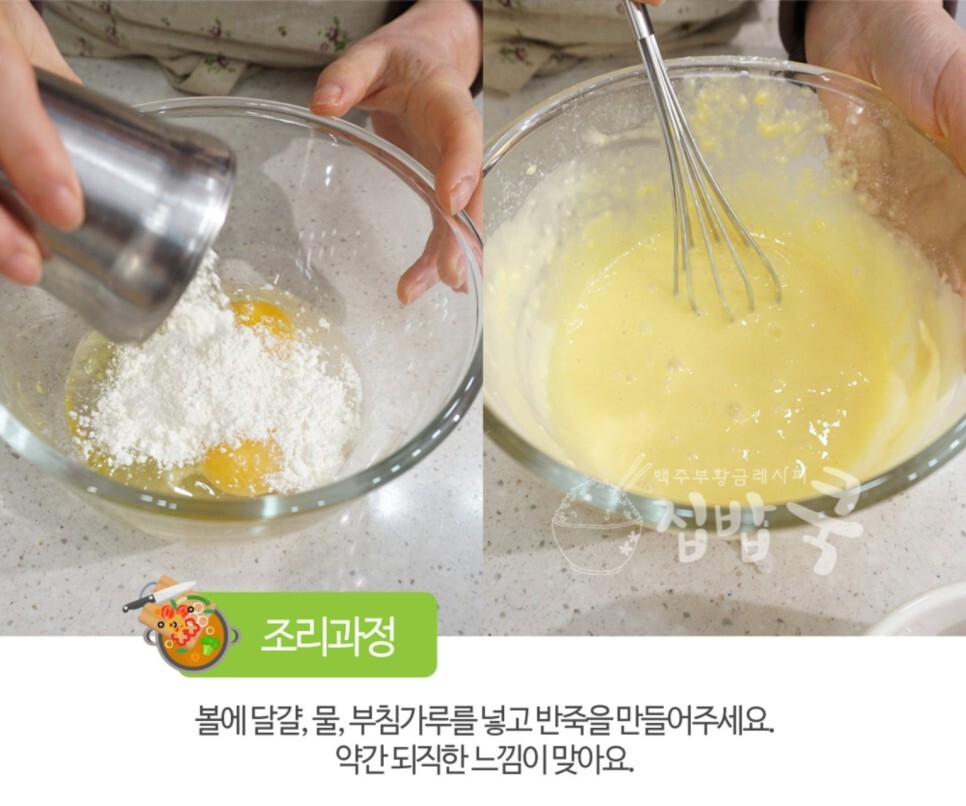 3. 볼에 계란, 물, 부침가루를 넣고 반죽을 만들어주시는데 약간 되직한 느낌이 들게 반죽 농도를 만들어주세요.