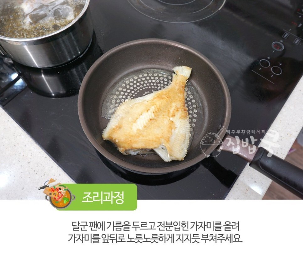 2. 달군 팬에 기름을 두르고 전분을 입힌 가자미를 앞뒤로 노릇노릇하게 지지듯 부쳐주세요.