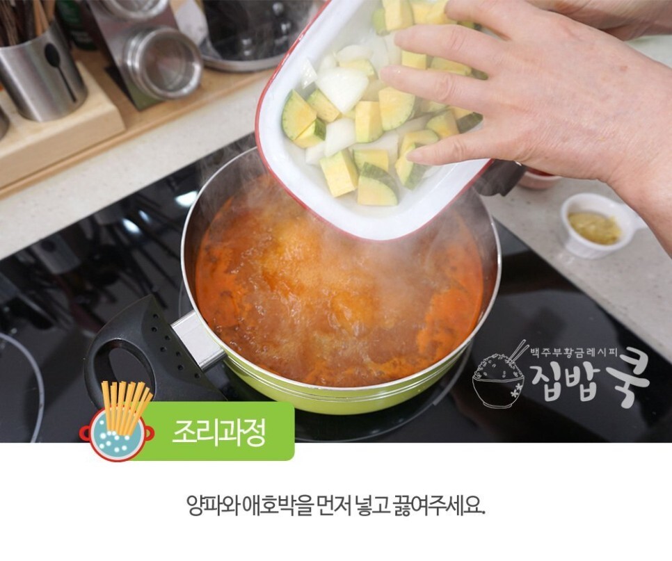 7. 양파와 애호박을 먼저 넣고 끓여주세요.